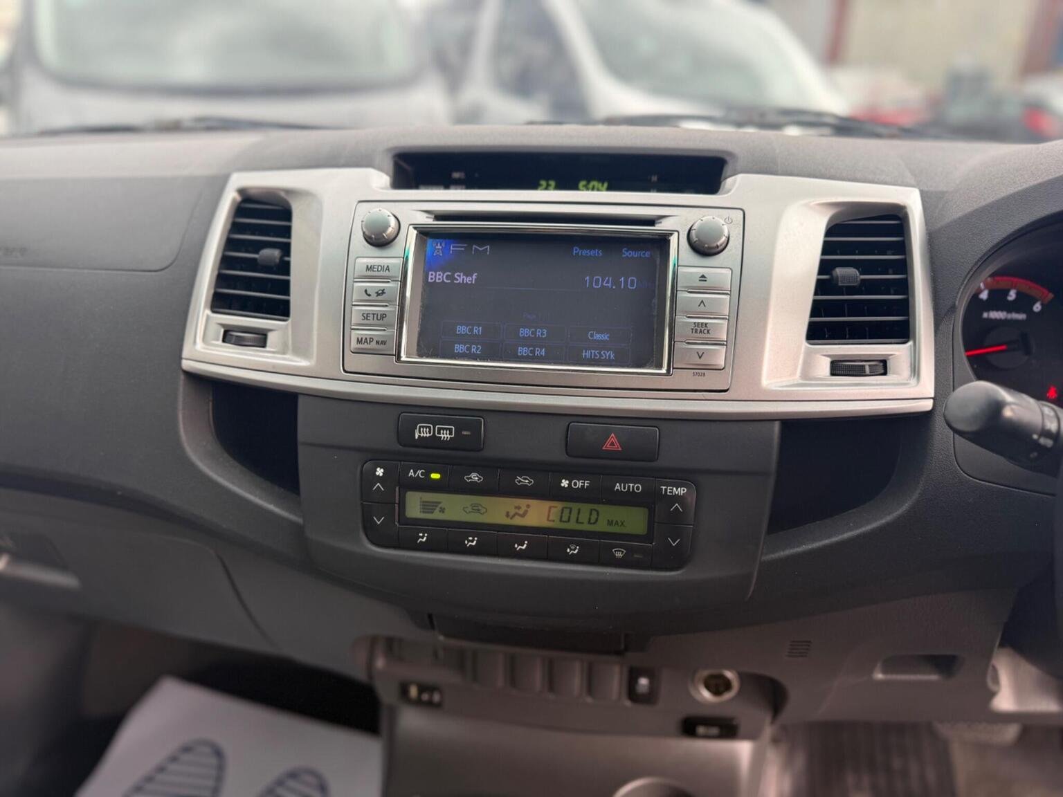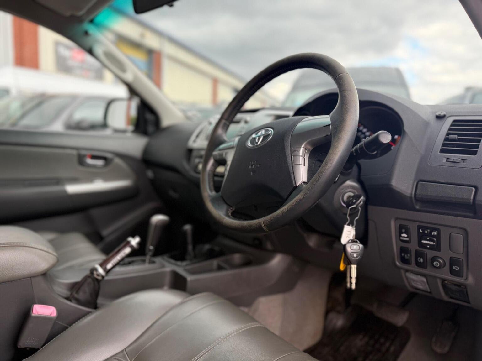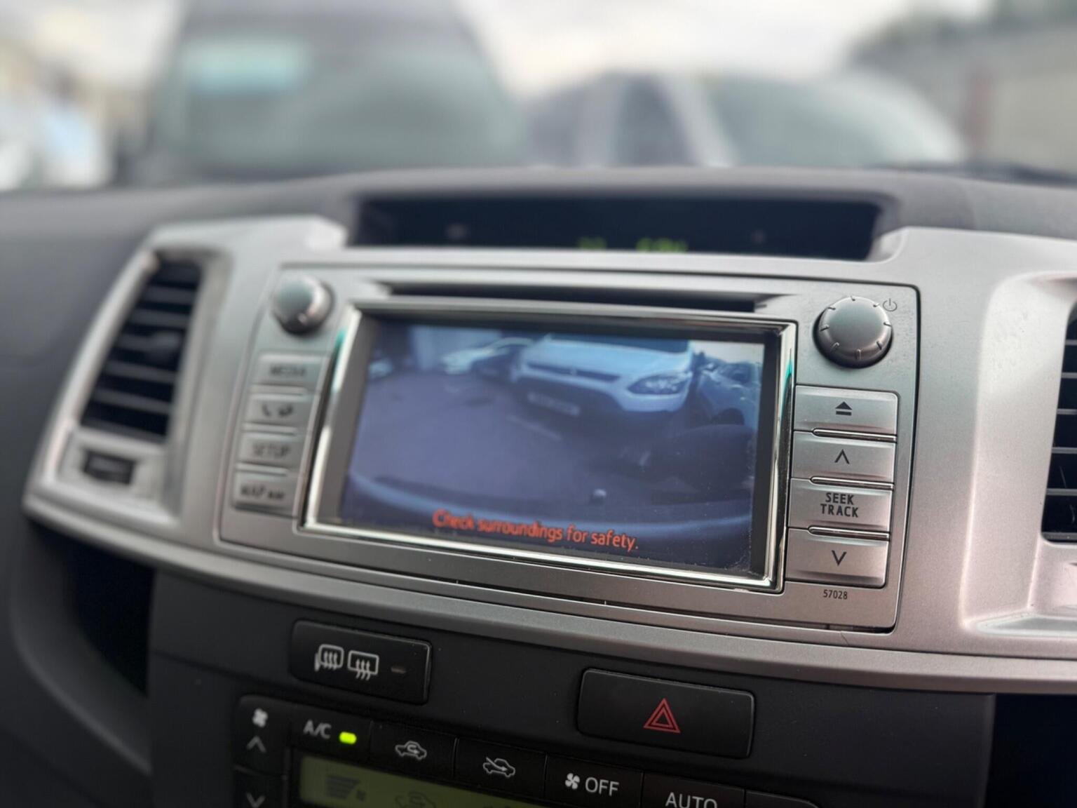 17in Alloy Wheels - 6 Spoke, ABS - Anti Lock Braking System, Airbags - Curtain, Airbags - Driver, Airbags - Front Passenger, Airbags - Front Side, Armrest - Front, Ashtray and Cigar Lighter, Automatic Air Conditioning, Aux-USB Connectivity for MP3 and iPod Connectivity, BAS - Brake Assist System, Bluetooth Connectivity, Body-Coloured Front Bumper, Bottle Holders - Doors, Bumpers - Body Coloured, Bumpers - Rear Chrome Plated, Child Protection Locks, Chrome Side Bars with Integrated Steps, Collapsible Steering Column, Console Box with Lid and Rear Cupholder, Cruise Control, Cupholder - Front and Rear, Differential Locking - Rear, Digital Clock, Door Handles - Chrome, Door Mirrors - Chrome Electric and Heated with Integrated Indicators, Driver and Front Passenger Sun Visors, Drivers Footrest, Dusk Sensing Headlights, Dusk Sensor, EBD - Electronic Brakeforce Distribution, Electric Windows - Front with Drivers Auto Up and Down, Engine Temperature Warning, Front - Double Wishbone with Coil Springs, Front Fog Lights, Front Grille Smoked Chrome with Chrome Surround, Fuel Heater, Fuel Indicator with Low Fuel Warning, Full Size Spare Wheel, Glovebox - Lockable, Headlight - Levelling Adjustment, Headlight Cleaners, Headlight Warning Buzzer, Headlight Washers - Electrically Operated, Headlights - Electronic Levelling, Headrests - Front Height Adjustable, High Mounted Rear Brake Light, Immobiliser, Impact Absorbing Headlining Material, Interior Light, Ladder Rack, Laminated Privacy Glass - Rear windows, Leather Gear Shift Knob, Load Sensing Proportioning System, Lockable Tailgate, Locking Wheel Nuts, Mud Flaps - Front, Mud Flaps - Front and Rear, Mud Flaps - Rear, Multi Information Display, Optitron Dashboard Display, Optittron Meters, Power Assisted Steering - Speed Sensitive, RDS with PTY and EON Settings, Radio Aerial - Roof Mounted, Radio and CD Player, Rear - Leaf Springs With Double Tube Shock Absorbers, Rear Headrests x3, Rear Seat - Removable Base, Rear Seat with Tip-Up Function, Rear Under-Run Protector, Rear View Camera, Rear Window Defogger, Rear Window Demister, Rear-View Camera Display on Toyota Touch, Remote Central Locking, Remote Release for Fuel Cap, Seat Belt Warning - Driver, Seats - Front Premium, Seats - Front Seat-Back Pockets, Seats - Front Sport, Side Impact Beams, Silver-Coloured Insert on Centre Cluster, Speakers x6, Steering Column - Energy Absorbing Deformable and Retracting, Steering Wheel - 4-Spoke Leather with Silver Inserts, Steering Wheel - Audio Controls, Steering Wheel - Leather Trimmed, Steering Wheel - Manual Tilt Adjustment, Steering Wheel 4-Spoke with Integrated Audio Controls and Leather Trim, Storage Box - Central Tunnel - Armrest, TVSS Category 1 Perimeter and Volumetric Alarm, Tachometer, Tilt Adjustable Steering Wheel, Touch Screen - 6.1in, Toyota Touch Audio System, Underseat Storage - Rear, VSC - Vehicle Stability Control, Vehicle Parts Marking - Major Parts Traceable to VIN, iPod and MP3 Connectivity